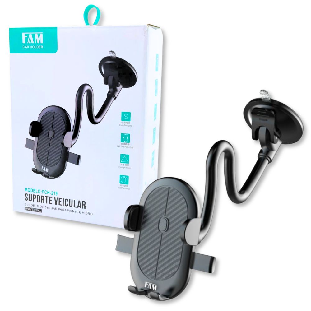 Com dupla fixação (painel ou vidro), o Suporte Veicular FCH-219 da FAM oferece versatilidade e resistência. Ideal para manter o smartphone acessível e seguro durante a direção, sem comprometer a visibilidade do motorista.